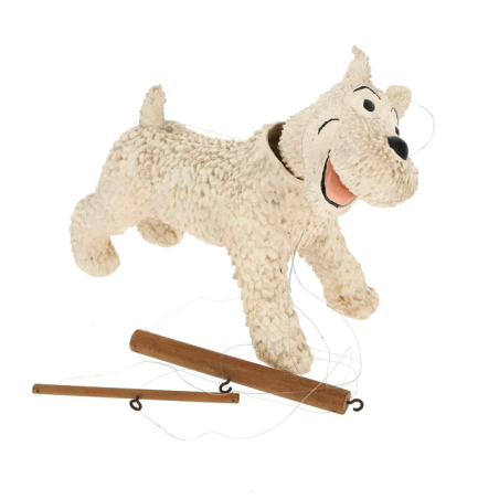 Hergé : LEBLON-DELIENNE : Marionnette de Milou, 1990, n°/300, +/- 40 cm. Sale, à nettoyer et fils coupés noués.