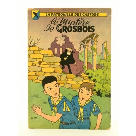 La patrouille des castors, par Mitacq. Volume 1 : Le mystère de Grosbois. Eo belge de 1955. Petits manques sur le dos. Coiffes manquantes. 1 coin inférieur manquant, coins un peu frottés. 2 manques au 4e plat et petites inscriptions au 1er plat mais plats propres, très peu de plis. Petites déchirures sur 2 pages et petites traces de lecture mais intérieur propre !